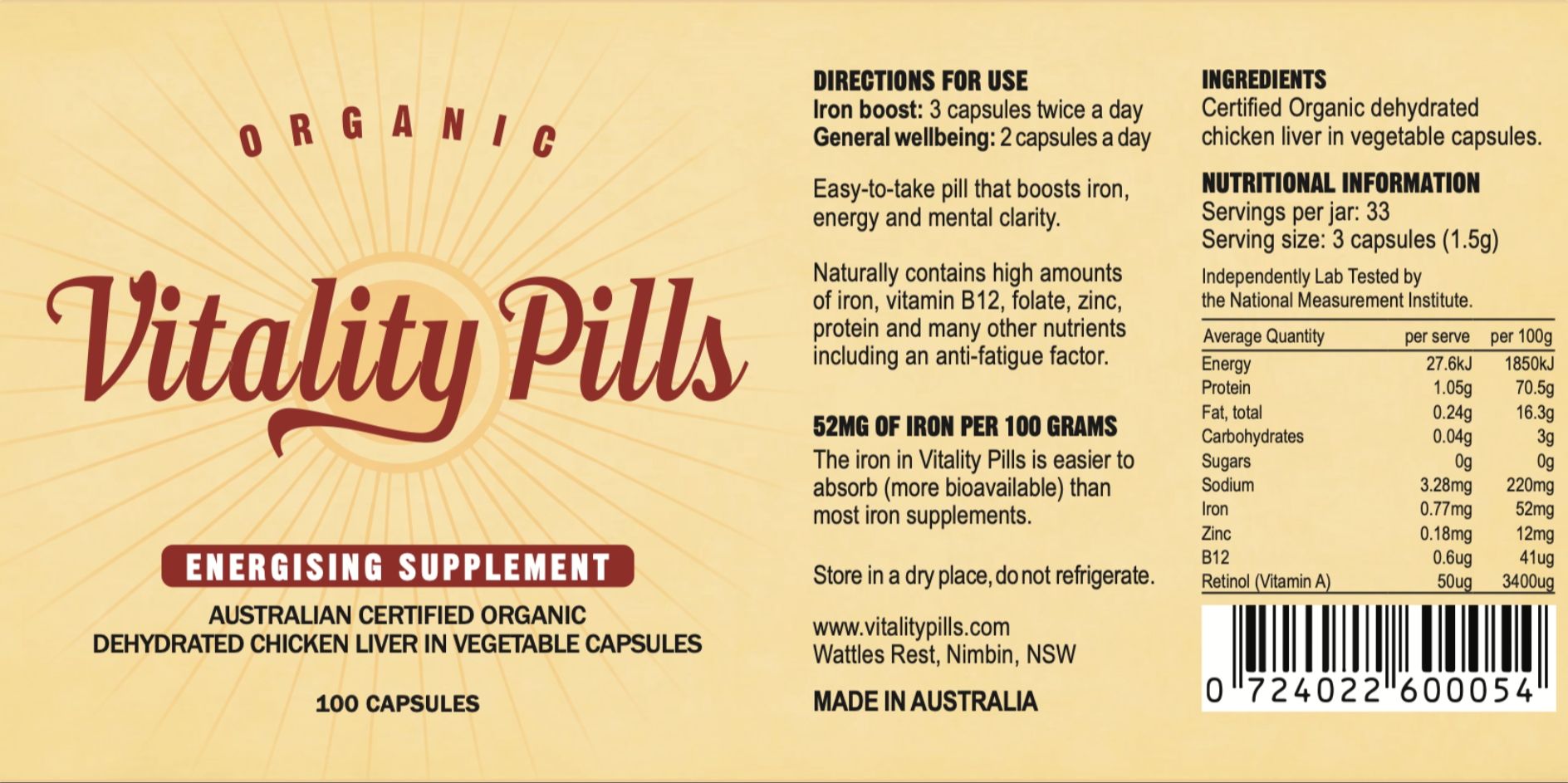 - 100% dehydrated organic chicken liver powder in vegetable capsules